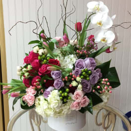 Price: $300.00 Pippa - phalaenopsis orchids, purple roses, spray roses, curly willow, tulips, hypericum berries and lush white hydrangeas Product Tags: Next-day Delivery