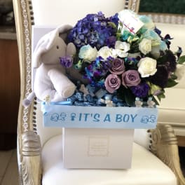 Price: $250.00 Baby Boy Basket - Blue Hydrangeas, White and Purple Roses and Spray Roses Product Tags: Next-day Delivery
